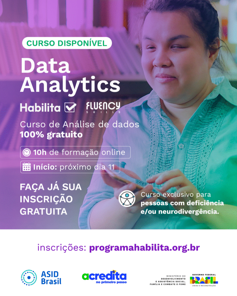 A grande novidade é o Curso de Análise de Dados (Data Analytics), com recursos de acessibilidade para todas as pessoas, realizado em parceria com a Fluency Academy. Ao todo, são 5.000 bolsas de estudos 100% gratuitas, com recursos de acessibilidade em libras, legendas e audiodescrição.